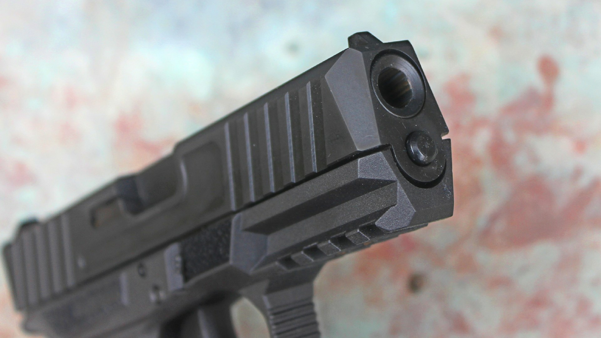 The milling process includes deep sets of serrations at the front and rear, crisp clean angular bevels to the slide's nose and edges along with subtle weight-reduction recesses on all three sides. The ejection port is also beveled. The extractor serves as a visual and tactile loaded-chamber indicator. The exterior styling of the slide contributes to a slightly lighter unloaded weight of 22.1 ozs., with an empty magazine.