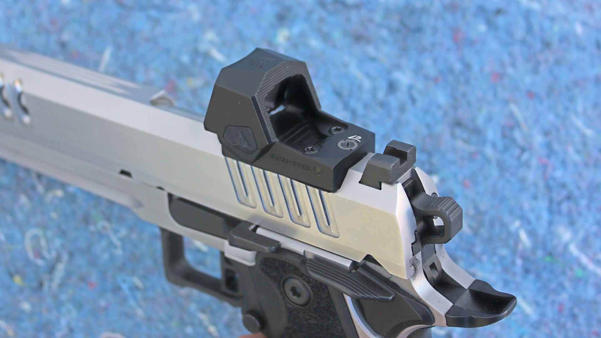 For this evaluation, the M2XI slide was topped with a Swampfox Sentinel II 3-MOA green dot optic (#SNL2120-GMS; $279). It has an RMSc footprint which proved to be compatible with the slide's Holosun K cutout. This sturdy little green dot's aluminum housing has a more angular profile that complements the pistol's styling. Once again, it proved to be a great fit for accurate shot placement.