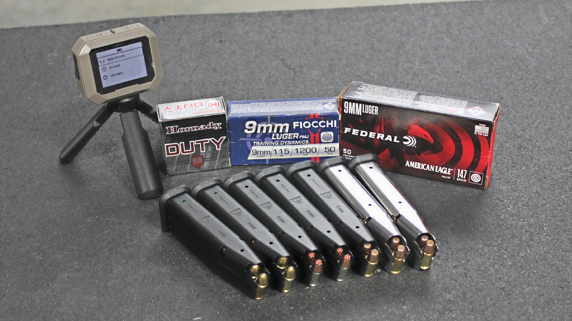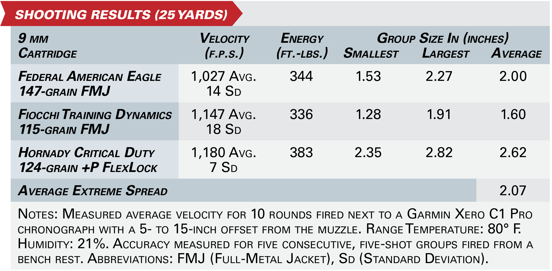 Formal performance testing was conducted by firing five, five-shot groups into paper targets posted at a distance of 25 yards. A Garmin Xero C1 Pro chronograph was used to measure the average muzzle velocities for 10-shot strings. The two practice-grade loads used included Federal American Eagle and Fiocchi USA Training Dynamics full-metal jacket offerings. Since some folks may choose to stage this pistol for personal protection, the test set was rounded out with Hornady's defense-grade Critical Duty 124-grain FlexLock +P load. Here are the results:
