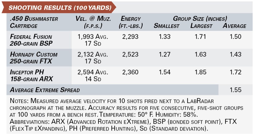 At the shooting range, the test 450 Bravo Zulu was put through its paces using a mix of .450 Bushmaster hunting loads. The rifle proved to be mechanically reliable, with all of the controls working smoothly, and no malfunctions were experienced. The DM2S trigger was a pleasure to work with. Although the Snake Charmer muzzle brake, textured pistol grip and rubber buttpad contributed to improved control for off-the-bench shots, it should come as no surprise that the felt recoil produced by this cartridge and carbine configuration was on the stout side of the AR-15 scale. Although not unpleasant to work with, new shooters will need some practice to get the feel for it before heading out into the field.