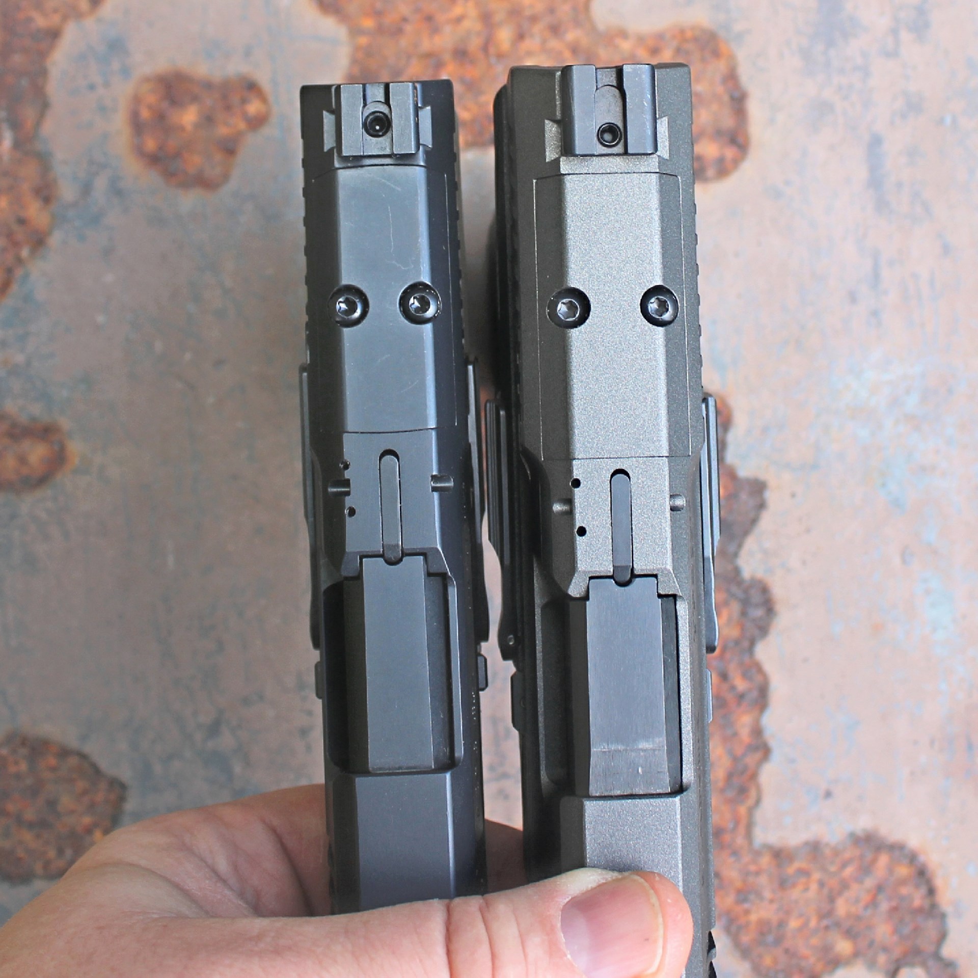 The Mete MC9’s slide (l.) is noticeably slimmer than those of the TP9 series (r.).