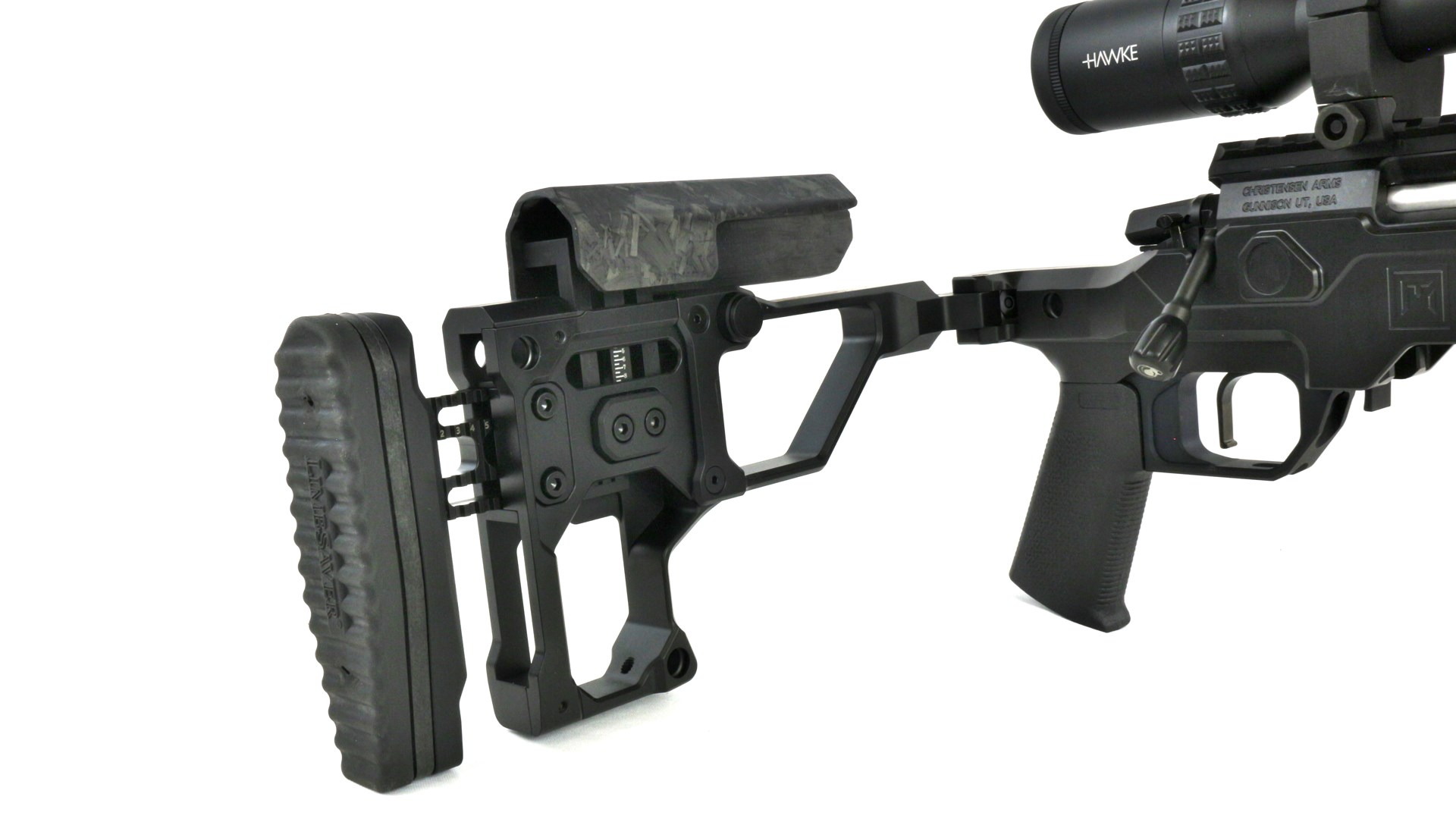 This flash-forging manufacturing process involves molding parts from a monocoque shell instead of using the conventional layering method. It yields a lighter product without sacrificing rigidity. It also doesn’t produce carbon-fiber waste, making it more environmentally friendly and cutting material costs. More carbon fiber is found toward the rear in the form of an adjustable cheek riser. A pair of flush-fit hex screws hold it in place, and a numbered scale helps dial in adjustments or repeat them when changed for another shooter.