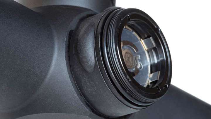 Three rubberized pressure switches on the left side of the scope body—surrounding the CR 2032 battery compartment—activate, turn off or change the red dot’s intensity. If inadvertently left on the unit shuts down after two hours. At full power battery life is estimated at 500 hours.