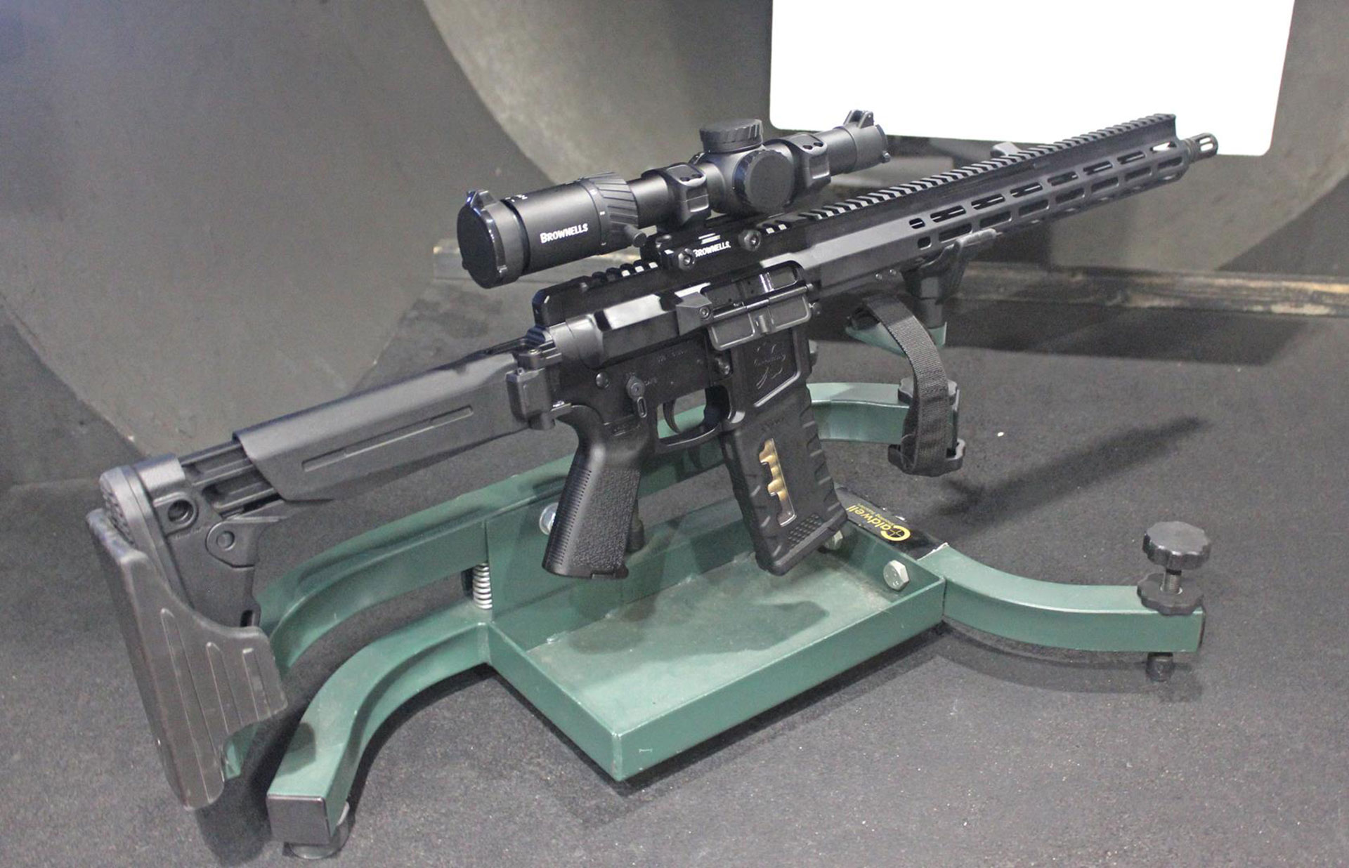 Because this carbine is a Brownells exclusive, it only seemed right to outfit it with a Brownells Match Precision Optics (MPO) scope for accuracy testing at 100 yards. This optic is the 1-8x24 mm version with an illuminated CQ-NOMR second focal plane reticle. It was secured to the rifle using Brownells 0 m.o.a. 30 mm Cantilever Scope Mount (080-001-351WB).