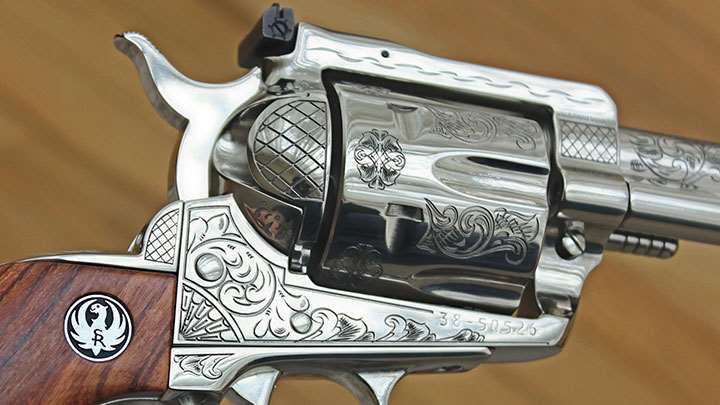 For this project, I opted to go whole hog and requested a full coverage set of engraving. I wanted classic cowboy floral flourishes with sections of geometric patterns, please. The more old fashioned the better! I opted for a high-polish nickel finish to bring out the patterns and designs. The checkered plastic grips were swapped out for a set of Ruger factory smooth-hardwood grip panels.