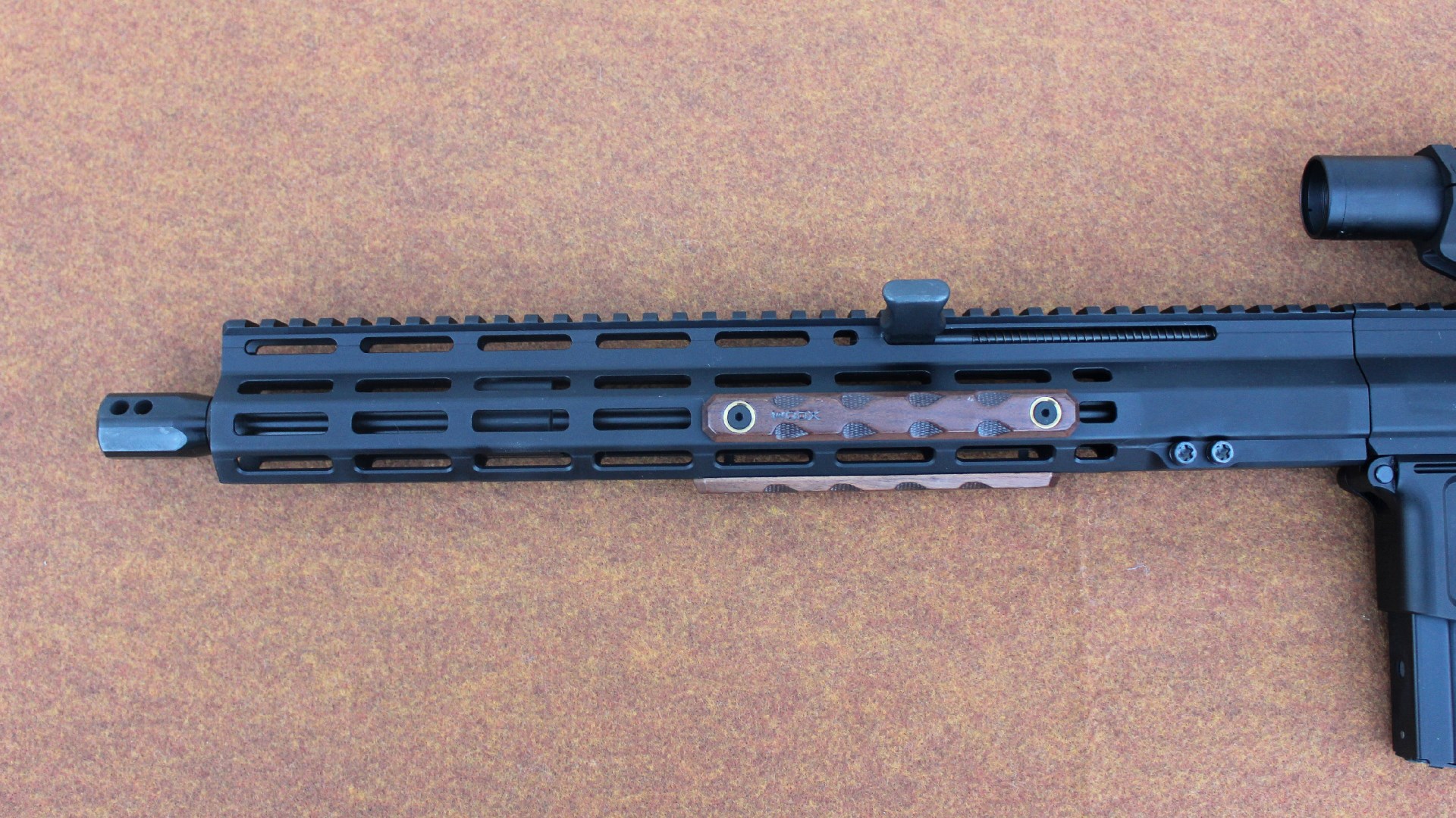 Due to the positioning of the recoil assembly, this rifle's non-reciprocating charging handle has been moved forward into the top of the 15" long, M-Lok-compatible aluminum handguard. The handle is mounted to a spring-loaded rod, which, in turn, engages the BCG's gas key. The polymer block handle itself can be removed and positioned to either side of the handguard with an upwards or, downwards angle, depending on the owner's preferences. The gun arrives from the factory with the handle angled upwards on the left side.