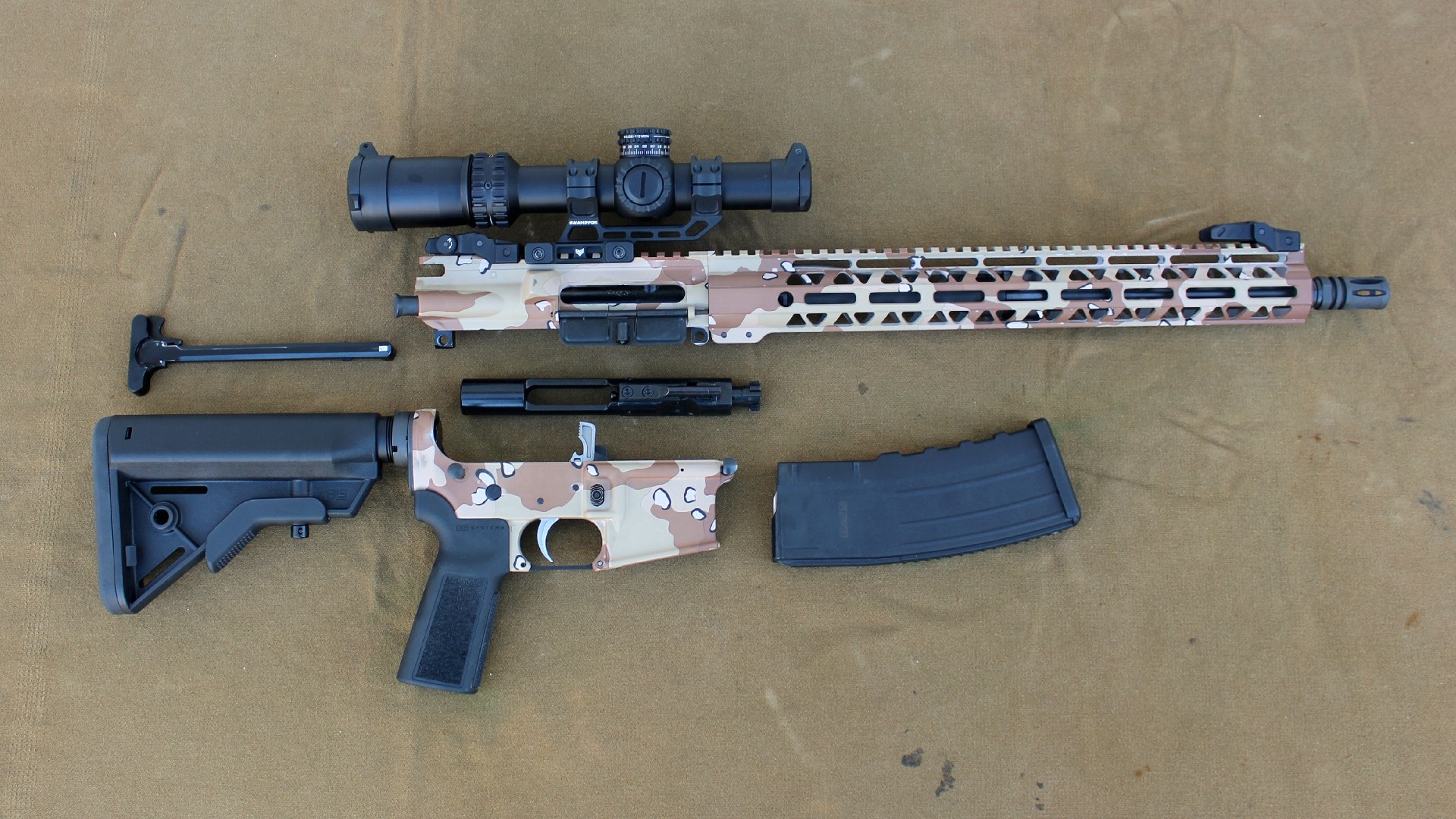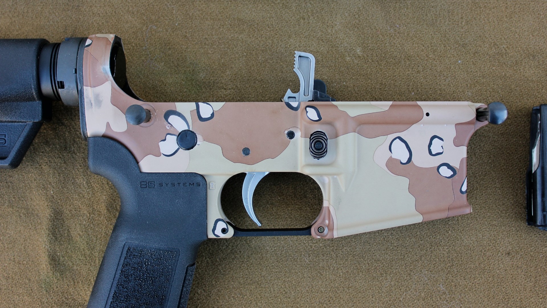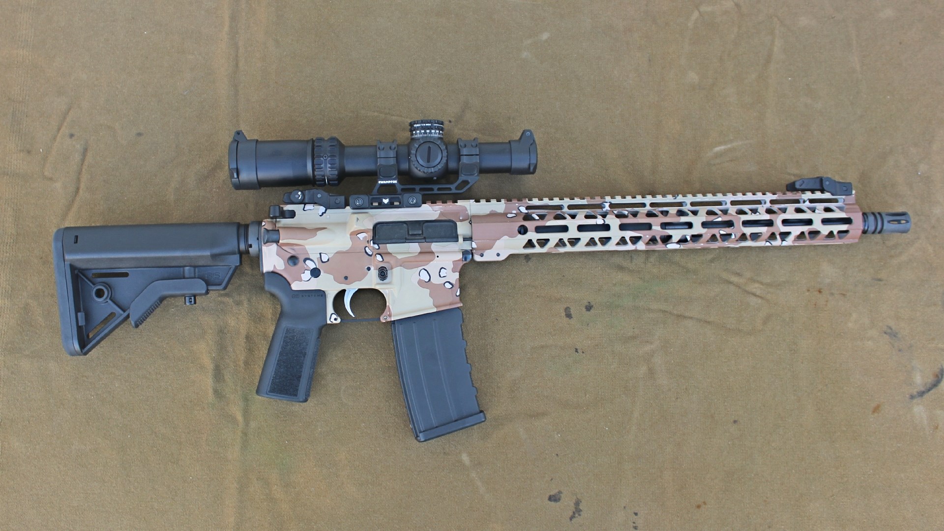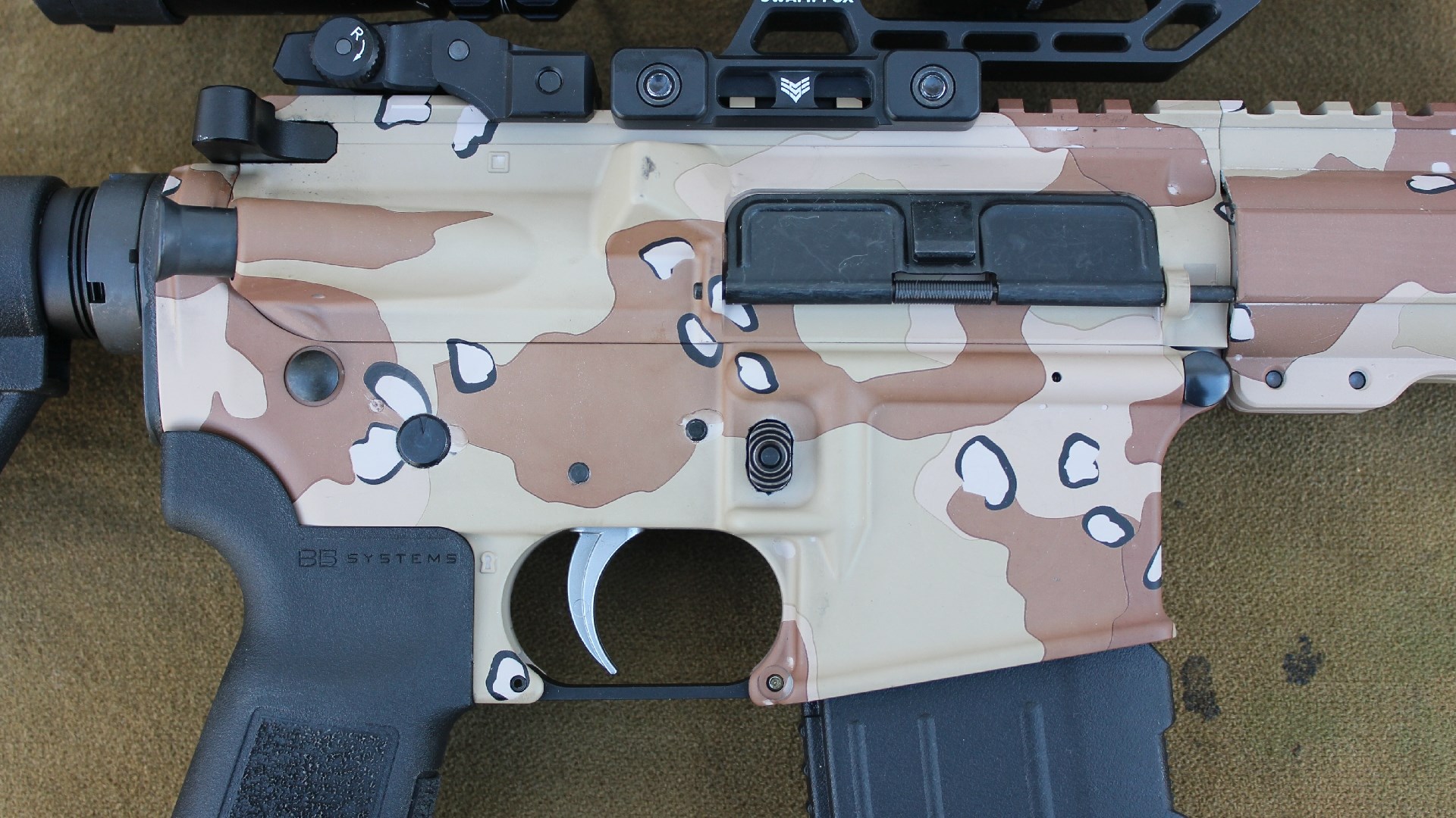 Now, let's dig into the upgrades for this model. The most obvious of these is the hydro-dip finish applied over the anodized surfaces of the handguard and both receivers. In this case, it’s the Six-Color Desert Pattern camouflage (aka. Chocolate Chip) which was popularized during Operation Desert Storm in the early 1990s. The company is also offering a US Woodland (M81) camouflage for the carbine and pistols.