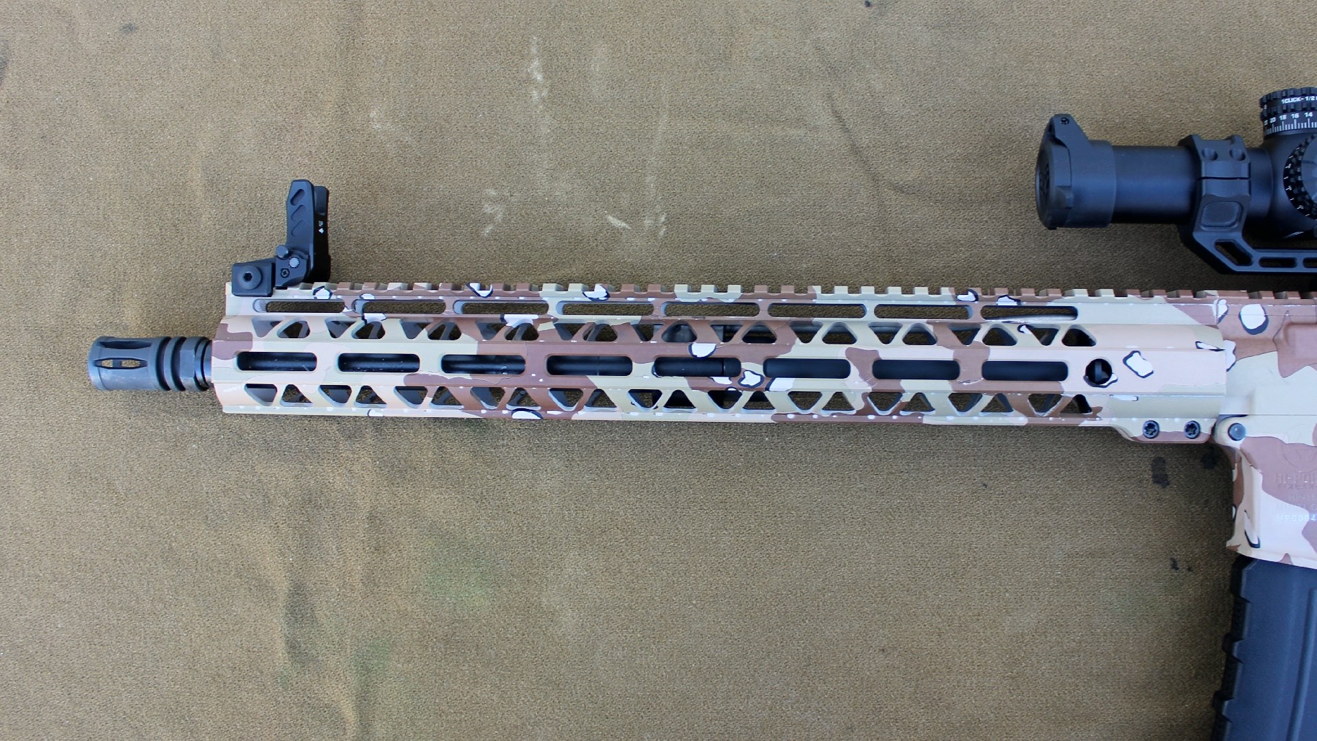 Sporting a carbine-length gas system, the M4-profile, 16-inch barrel is made of 4150 chrome-moly vanadium steel. Although it is listed as having a 1:8-inch rifling twist rate, the gun I received had a barrel marked 1:7. The muzzle is threaded at 1/2x28 TPI and fitted with a removable A2 flash hider. The 15-inch long, free-floating aluminum handguard is a lightweight configuration with a full-length optics rail along the top, plenty of vents and several M-Lok slots for mounting accessories.