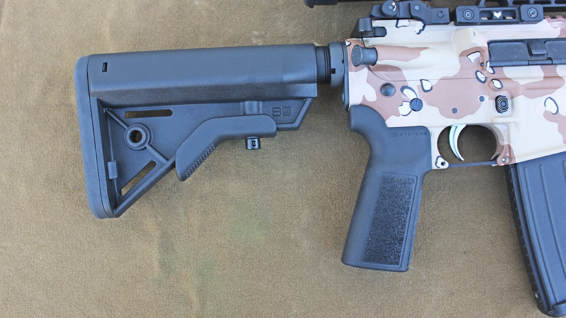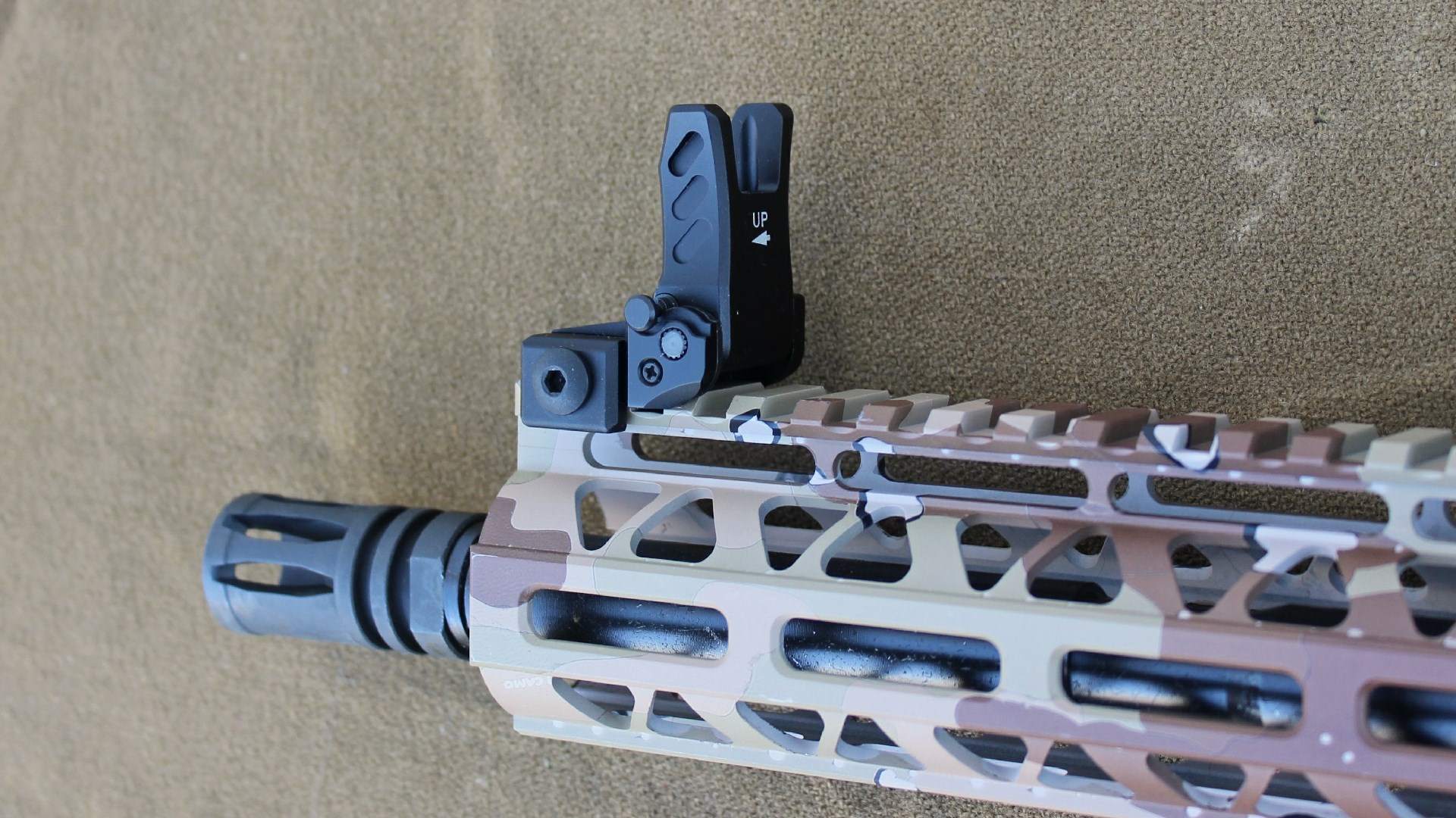 Unlike the black models, the camouflage guns ship with a set of metallic UTG flip-up sights. The front sight's post is adjustable for height while the rear sight sports a windage adjustable dual aperture for close and long range shooting. The basic A2 furniture has been replaced with options from B5 Systems. The polymer P-Grip pistol grip is light weight and has aggressive texturing along the front strap and both sides for improved purchase. The lower receiver's six-position, mil-spec aluminum buffer tube is fitted with an M4-style Bravo shoulder stock, the same one used by the U.S. Army for its M4/M4A1 carbines. Its features include a comfortable cheek weld, dual steel QD sling ports and a soft rubber butt pad.