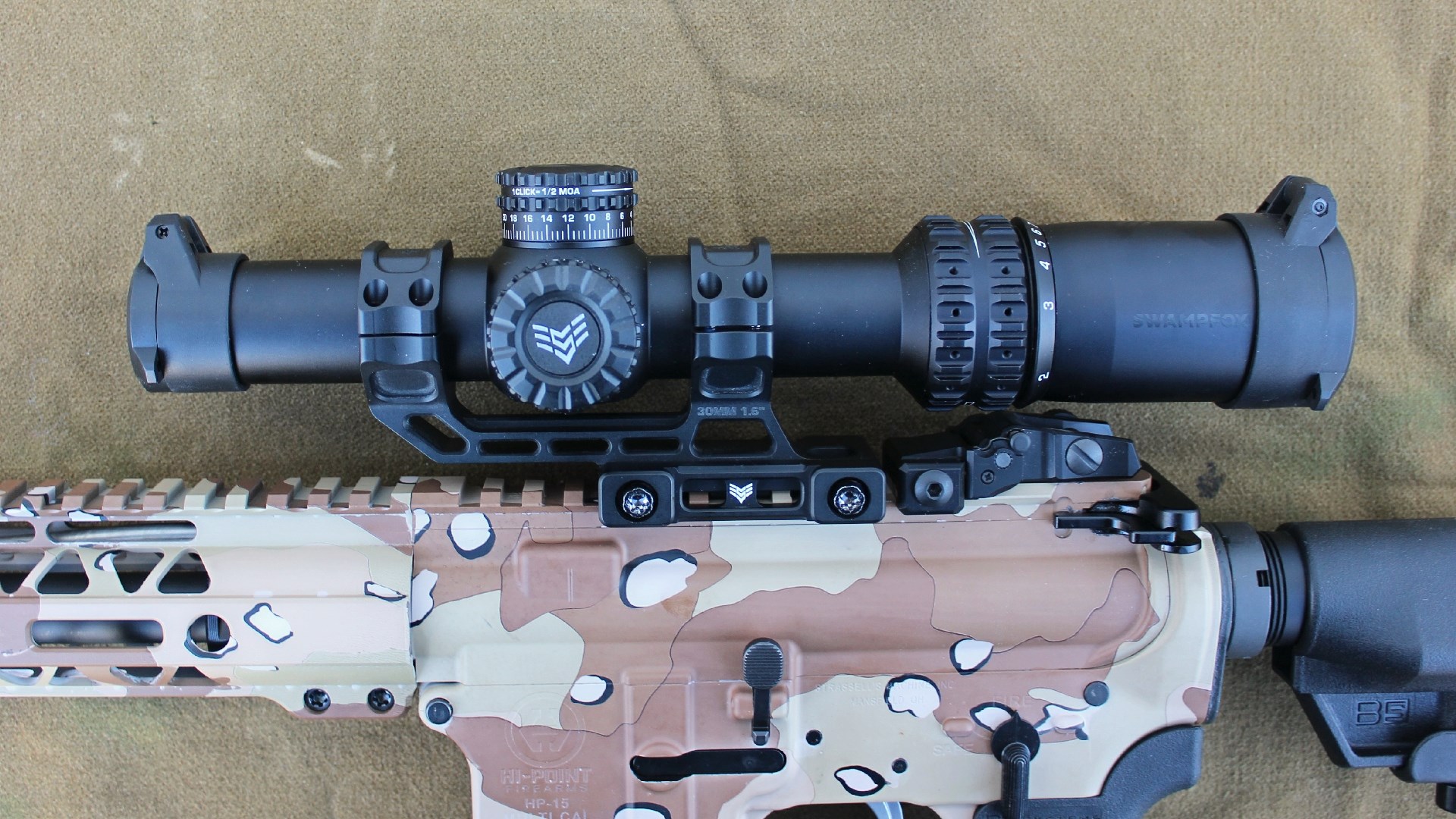 For this evaluation, the HP-15 was topped off with a Swampfox Arrowhead SFP LPVO 1-8X 24 mm SFP III optic (ARH18241-GB; $419). The second focal plane (SFP), glass-etched Guerrilla Dot BDC reticle features 12 brightness settings for the green illumination. Powered by a single CR2032 button cell battery, it has a 30 mm tube, .5-MOA click adjustments and push/pull locking turrets with a zero reset. This optic was mounted onto the carbine using a Swamp Fox lightweight 7075 aluminum Freedom cantilever mount (FCM-30-M; $139).