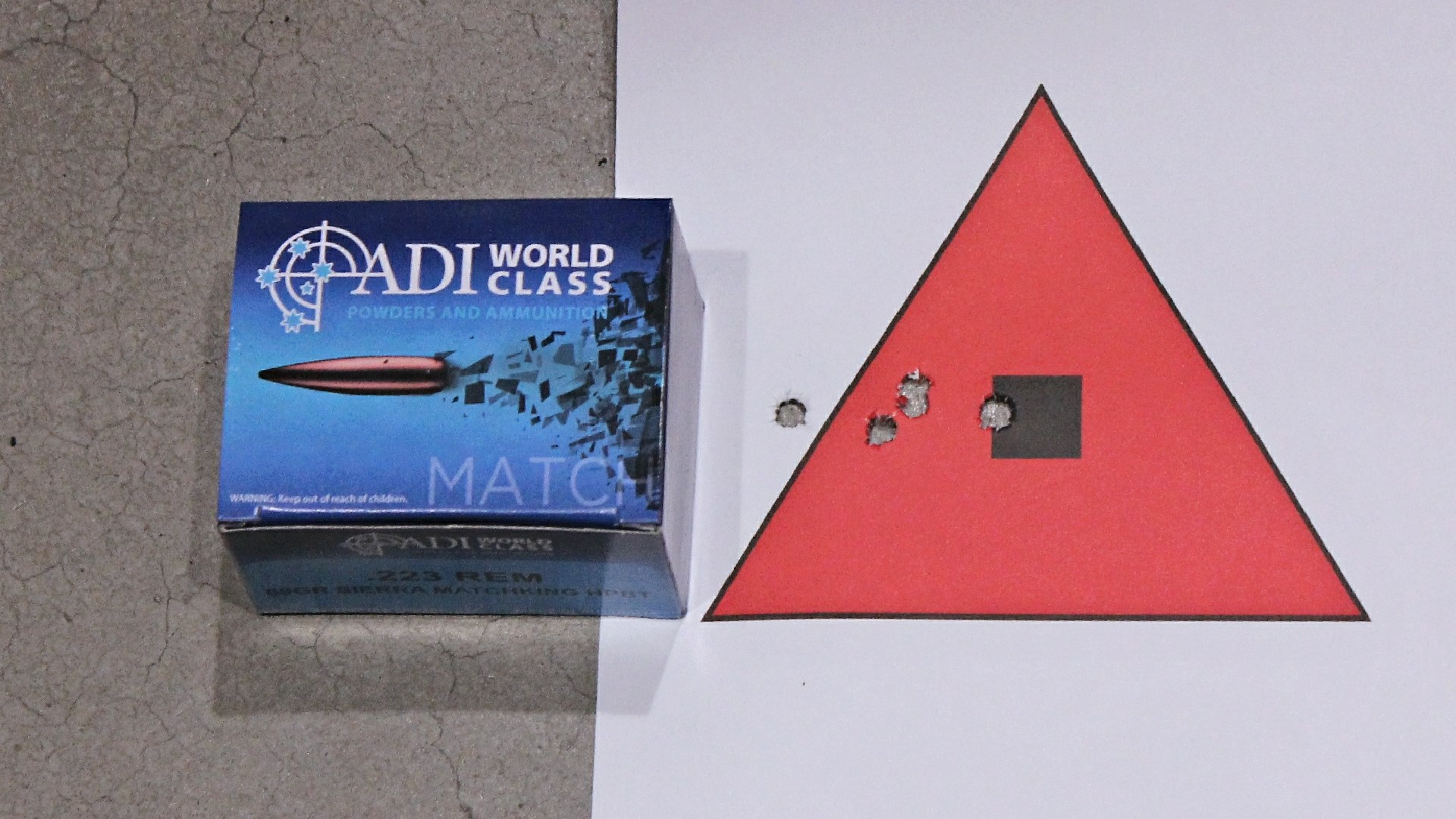 For the formal performance testing, five bench rested five-shot groups for three loads were fired into paper targets posted at a distance of 100 yards. A Garmin Xero C1 Pro chronograph was used to measure bullet muzzle velocity averages for 10-shot strings. The .223 Rem. ammunition used included ADI World Class rounds (imported by Global Ordnance) topped off with Sierra Bullet's 69-grain Match King open-tip match bullets, Federal Premium American Eagle 55-grain full-metal jacket loads and Winchester's USA Ready 62-grain open-tip match. Here are the results: