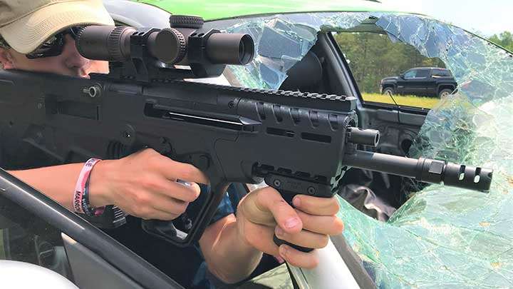 A combination of factors makes the Tavor 7 bullpup seem lighter and handier than its 9 lbs. would suggest. Its shorter overall length, center of gravity toward rear of rifle and hand positioning contribute to this. Several magazines worth of ammunition was spent engaging plate racks and man-sized steel targets.