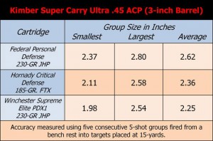 The Super Carry was fed a variety of .45 ACP loads, ranging from affordable bulk rounds to hopped-up defensive hollow-point loads. The pistol ran reliably without any malfunctions throughout informal and formal testing. Accuracy was checked by firing five, five-shot groups using three different loads into paper targets at 15 yards from a benchrest. The best single group of 1.98 inches was produced using Winchester Supreme Elite PDX1 230-grain bonded-jacket hollow points. It also produced the best five group average of 2.25 inches, followed by Hornady Critical Defense 185-grain FTX at 2.36 inches and Federal Personal Defense 230-grain jacketed hollow points at 2.62 inches.