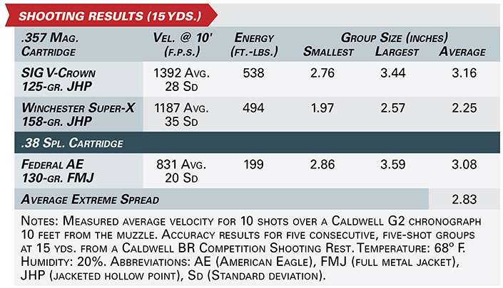 All loads tested produced more than acceptable accuracy for combat effectiveness, and the new revolver shot particularly well with the Winchester 158-gr. hollow points, producing 15-yd. groups as small as 1.97" in diameter. All accuracy testing was conducted in single-action mode, while the remainder of the rounds were fired for function in double action.