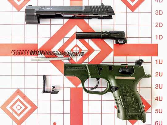The slide itself comes off the frame by pushing forward. Now, the recoil spring guide and the twin springs it holds can be removed from inside the slide, as well as the barrel. At this point the B6C is ready for cleaning. I asked for a B6C with an olive drab green frame, a nice change from all the black-on-black handguns I review.