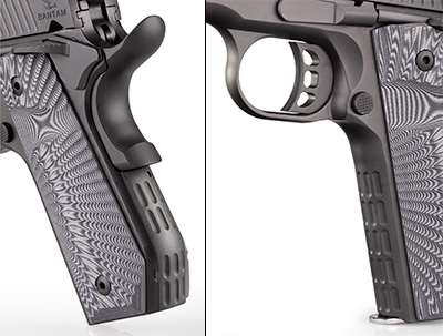 Machined from billet aluminum, the frame of the Bantam is designed to be light enough to carry but strong enough to resist deformation during firing. A “bobtail” cut in the bottom, rear corner of the frame provides relief for the heel of the hand and makes the pistol a bit more concealable. Other features include slot-style stippling on both the frontstrap and backstrap, as well as similar indexing points toward the front end of the frame.
