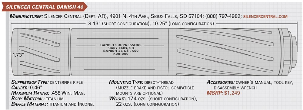As alluded to above, .30-cal. rifle cans have long been the option of choice for shooters who were seeking a singular “do-all” suppressor that could be used on a multitude of their rifles. But by adding big-bores, semi-automatic pistols and .338 Lapua Mag. to its list of potential hosts, Silencer Central’s Banish 46 takes that adaptability to an entirely new level. Given its versatility, tremendously high maximum cartridge rating, numerous mounting options, simple maintainability and relatively reasonable price tag, the “one-and-done” suppressor buyer will have trouble finding a better option than the Banish 46.