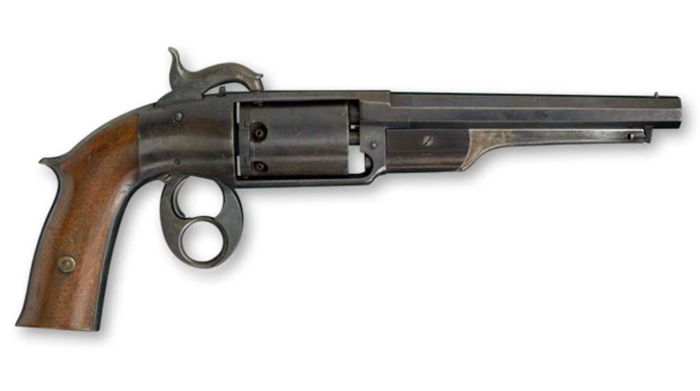 While other revolver inventors probably attempted to seal the cylinder/barrel breech gap before that, the earliest successful production revolver that I’m aware of that specifically addressed the problem was the North-Savage revolver, which was based on a June 17, 1856, patent by Henry North (Number 15,144). This revolver design included a toggle link to push the cylinder forward against the barrel to effect a gas seal. The earliest production revolver to use the patent was the “Figure 8” North-Savage revolver. Pulling back the lower trigger pulled the cylinder back, rotated it and cocked the hammer. This act also compressed a strong spring that encircled the cylinder arbor. Releasing the lower trigger allowed the cylinder to move forward under spring pressure and close the cylinder/barrel gap. The pistol was then fired by pulling the upper trigger. This certainly lessened the escape of gas, but did not truly seal the joint. Only a few hundred of the Figure 8 revolvers were made, and only about 20,000 of an improved version—the “Savage Navy” of the Civil War period—were manufactured, with about 12,000 of them being sold to the U.S. Army and Navy. They were very unpopular. The mechanism was more complicated than all other revolvers of the time (except the Starr self-cocking revolver), less reliable and more difficult to operate. Many officers and men of both the Army and Navy considered them dangerous to use.