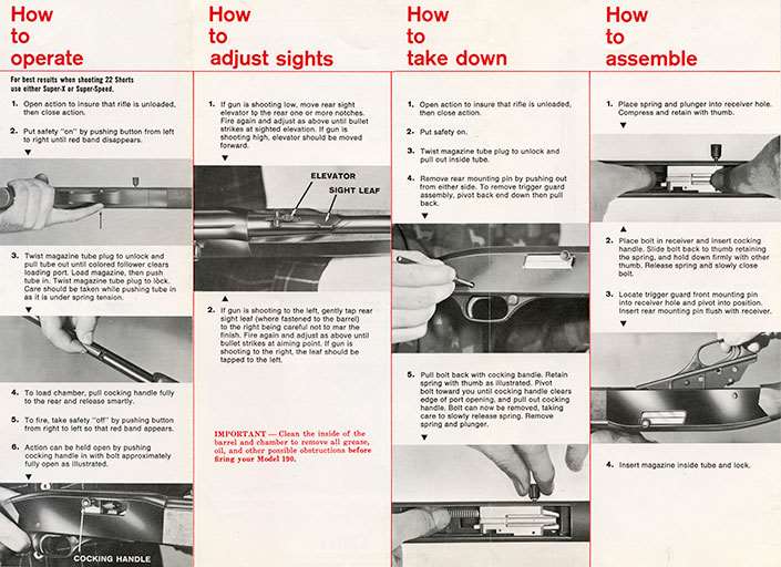 A: The Winchester Model 190 semi-automatic .22 rimfire rifle was manufactured from 1967 to 1980. It was basically a variant of the Model 290, which first appeared in 1965, but did not have the 290’s select Monte Carlo stock. Model 190s came in both rifle and carbine configurations. Including the 290, some 2,171,263 were made. I suggest you try contacting Cornell Publications, LLC. (Dept. AR), P.O. Box 214, Brighton MI 48116; (810) 225-3075 in your quest for a manual. An original is illustrated here.