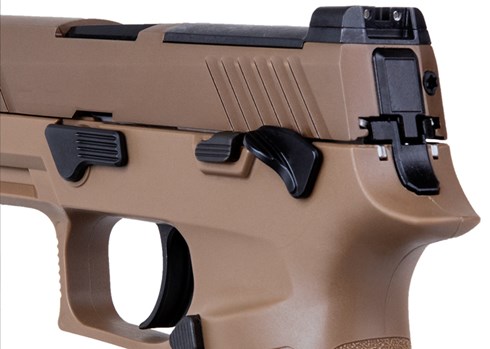 The P320-M18 is a 9mm striker-fired pistol with an exclusive “M18-XXXXXX” serial number that comes with one 17-round magazine and two 21-round magazines. The pistol features a SIGLITE front night sight and a removable night sight rear plate as specified by the MHS contract. The slide is optic ready and with the rear sight assembly removed, the SIG Sauer Electro-Optics ROMEO1Pro Optic mounts directly to the slide. The P320-M18 is configured nearly identically to the U.S. military’s models and features black controls, a carry-length coyote-tan grip module, coyote PVD finished slide, and an ambidextrous manual safety. The P320-M18 is also available in a state-compliant version and is currently listed on the Massachusetts handgun roster.