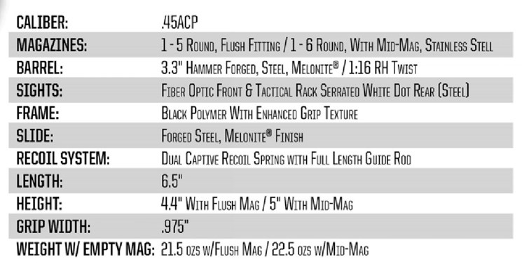 The pistol boasts a slim, single-stack frame just 6.5” long and less than 5” high. The 3.3” barrel is Melonite-treated hammer-forged steel, with a 1:16” RH twist. Dual springs and a full-length guide rod help add a level of comfort while shooting the .45 loads in a subcompact pistol.