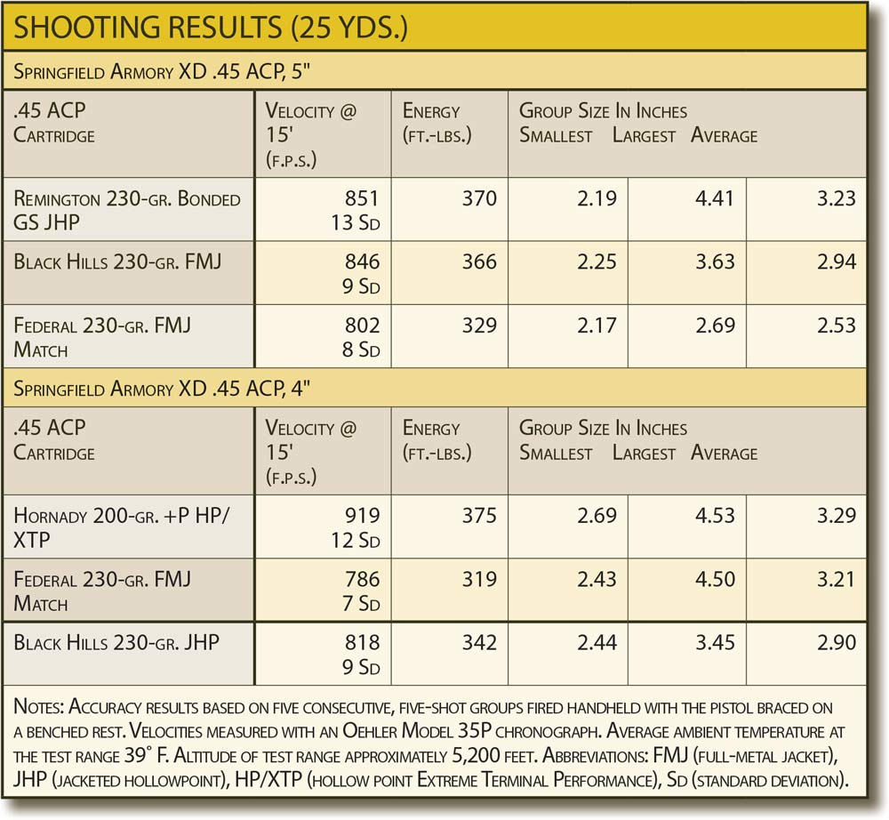 I fired each of the two pistols shown in this story in both accuracy evaluations from the bench and in a few tactical drills. In doing so, I found that the trigger action and the recoil properties of the shorter gun were much to my liking. This is not to say that the longer gun was deficient in any way, it’s just that the 4" XD seemed a bit easier for me to handle. The accuracy of the two guns was on a par with most modern guns, and you can see just how they performed in the adjacent tables.