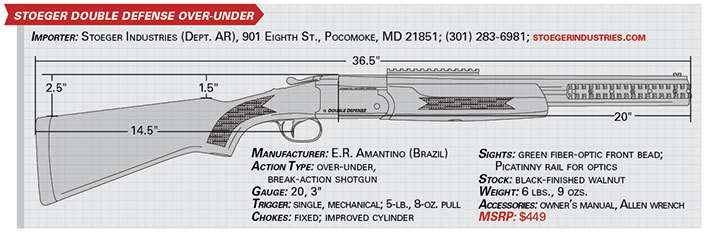 The Double Defense over-under shotgun impressed me as a well-made shotgun capable of providing the reliability needed for home defense. During my evaluation there were no malfunctions or problems of any kind with the gun. Even though the gun sports 20" barrels, its short overall length of just 36.5" and its ideal balance, right at the hinge pins, make it a handy house gun for use in tight spaces. Weighing just 6 lbs., 9 ozs., unloaded, the gun should be light enough for most family members to handle easily.