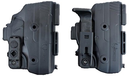 The shell arrives with a factory installed adjustable tension unit (left) to keep the pistol firmly secured in the holster until drawn. It can be loosened or tightened using one of the Twist Lock knobs as a wrench. This tension unit can be traded out for a provided thumb release lever (right) if preferred. The thumb release is compatible with all of the holster configurations.