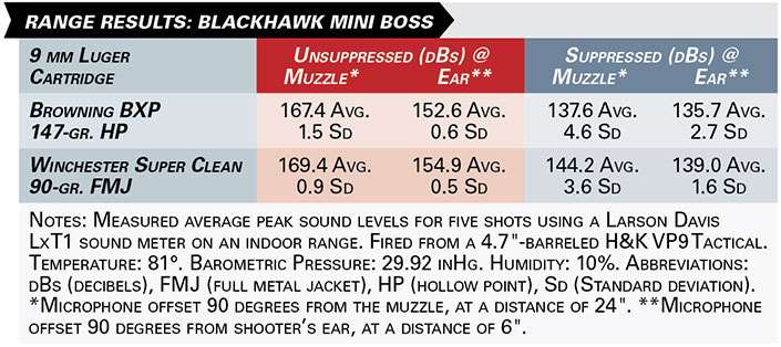 At the range, affixed to a Heckler & Koch VP9 Tactical, the Mini Boss suppressed the subsonic Browning load’s report from a dangerously loud 152.6 dBs at the ear to a much more tolerable level of 135.7 dBs. Meanwhile, the sound reading for the light-for-caliber, 90-gr. Winchester load was 154.9 dBs unsuppressed and a hearing-safe 139.0 dBs when fired through the can. Gas blowback was an occasional issue, however, the piston worked perfectly as intended—functioning of the semi-automatic pistol was 100-percent.