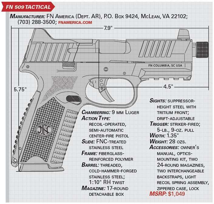 The FN 509 Tactical is shown here with its factory 24-round magazine in place. The gun’s rear sight ears have been removed and an optics plate has been installed with a Trijicon RMR. Also, a Gemtech GM-9 9 mm suppressor has been fitted to the 509’s threaded barrel. (The RMR and suppressor are not included.)