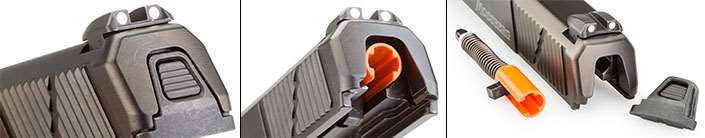 If you’ve followed along, a picture should be taking shape wherein Mossberg, despite being out of the handgun game for most of the past 100 years, has introduced a very refined personal-defense pistol that is heavily influenced by and, in many ways, similar to its more seasoned competitors. One area where the MC1sc breaks away from the crowd is in its safe disassembly procedure. Rather than incorporating takedown levers or tabs, or requiring the trigger to be pulled during disassembly, Mossberg engineered an entirely different method to improve safety during maintenance. With a cleared gun—magazine removed and chamber checked—users need only lock the slide to the rear, remove the rear slide plate by pressing the integral button and pulling it down and out, and then extract the striker assembly from the rear of the slide (the component is especially hard to miss thanks to its blaze orange polymer shroud).