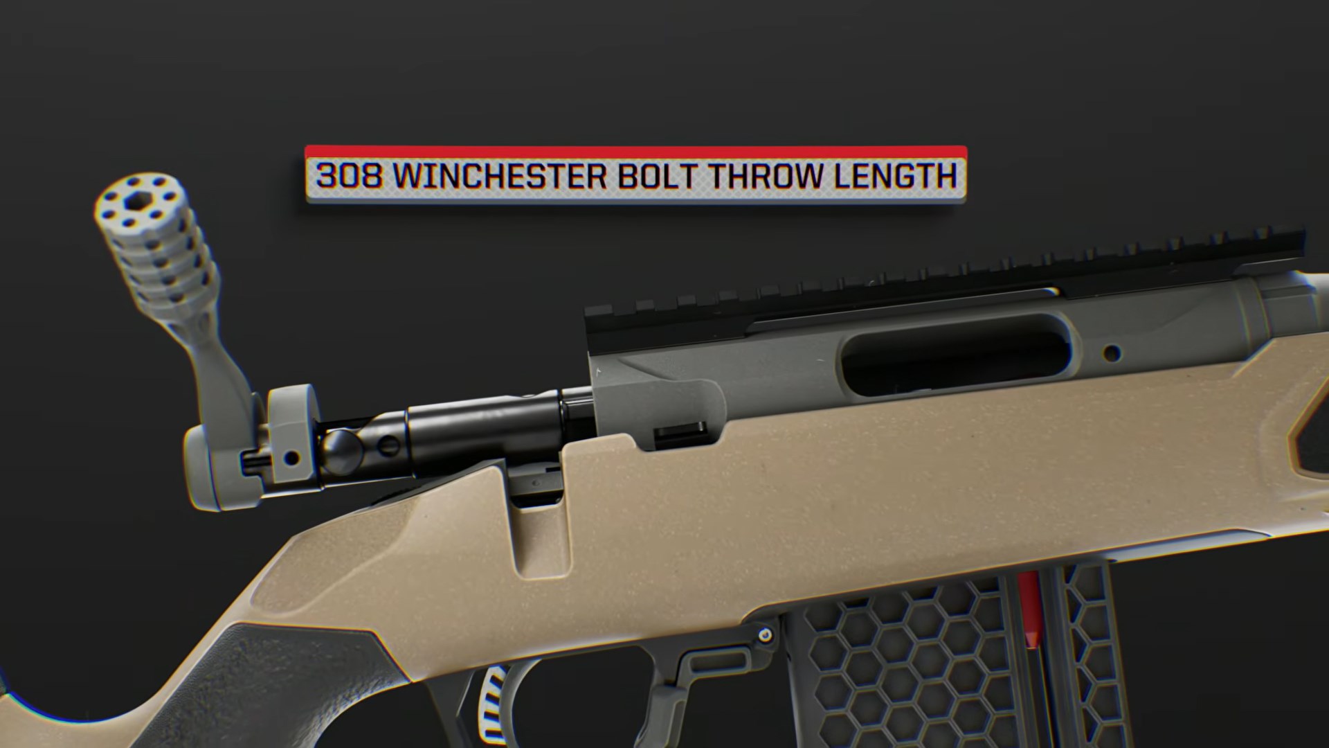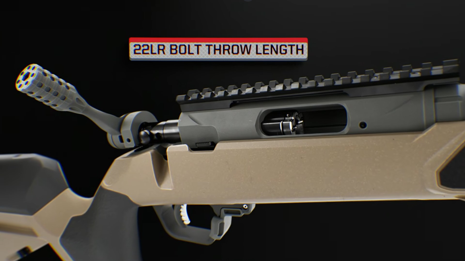 Two major changes are made to the 110 to adapt it to a rimfire chambering. The bolt, which still uses front locking lugs, utilizes a newly-designed reversible front baffle that allows the bolt throw length to be quickly adjusted by the user, giving it either the travel of a traditional short action for training purposes and or a shortened length for a .22 LR cartridge for faster operation.
