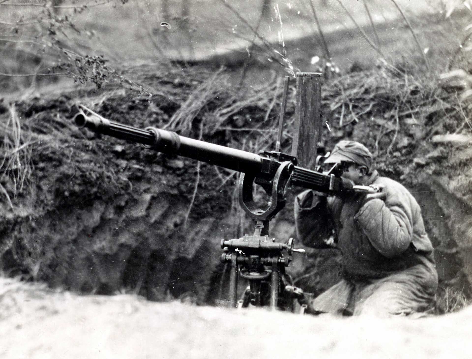 Japan's heavy machine gun was the Type 3 HMG, a weapon based on the Hotchkiss M1914 design. Fed by 30-round feed strips, the Type 3's low cyclic rate (450 rpm) created a staccato firing signature that earned it the nickname "woodpecker."