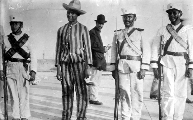 Mexican Federal troops escorting prisoners out of Veracruz. They carry the 7 mm Mexican Mauser Model 1902. It appears that the soldier at right has little concern about gun safety.
