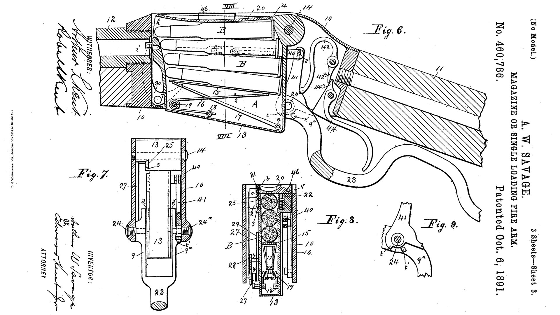 From the days of the Civil War through the 1880s, the tubular magazine predominated on repeating rifles, even on “modern” turn-bolts like the Vetterli, the 1871/84 Mauser, and the revolutionary Lebel. But during the 1880s, the box magazine, designed by James Paris Lee, was also gaining popularity in bolt-action rifle designs. By the early 1890s, Arthur Savage was experimenting with box-magazine-fed lever-actions, leading to his Model 1895 (which evolved into the Model 1899).