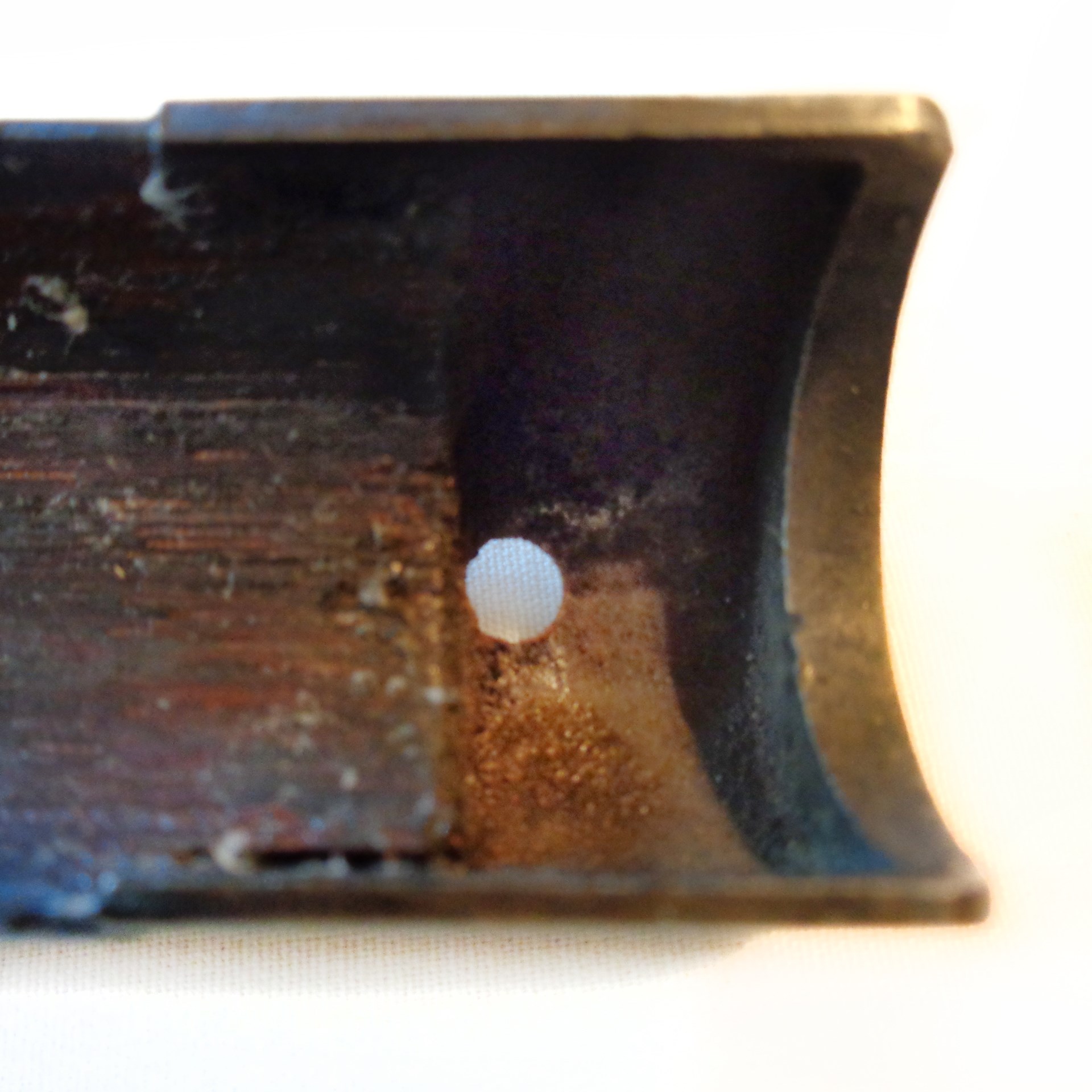 The little rectangle of disintegrating paper (with the initials “JH” on it) had been glued in the rifle stock’s barrel channel on an area that, over time, had deteriorated from the bacteria in the animal hide glue. When first noticed, it was mistaken for a splice block. Image courtesy of author.