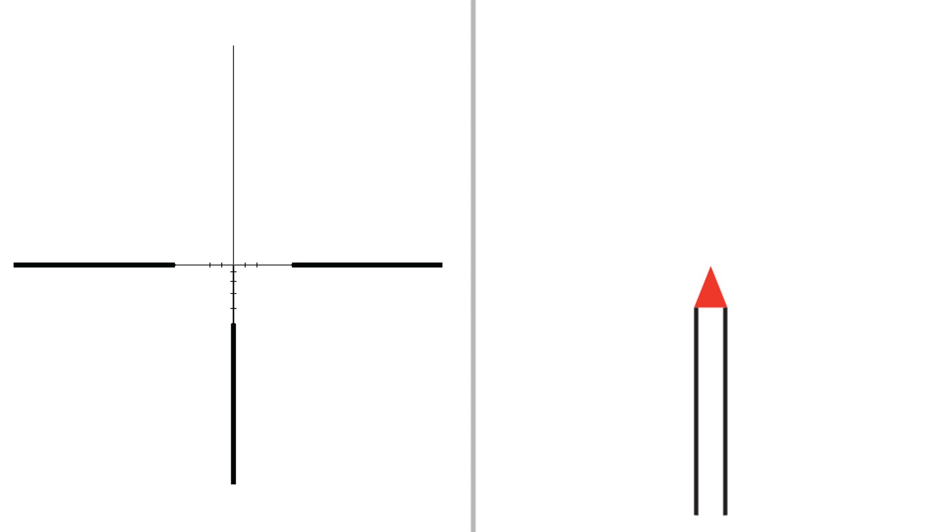 The AccuPoint 1-8x24 is available with two reticle options: the Dangerous Game BDC Hunter Holds reticle with a green dot or the red triangle post. Both have battery-free illuminated reticles, powered by tritium and fiber optics, that automatically adjust reticle brightness to match ambient light, along with a patented manual brightness override control.