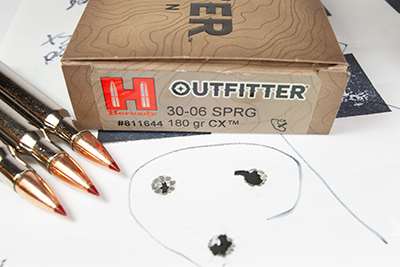 CX bullets are loaded in two of Hornady’s rifle ammunition lines. Five cartridges are loaded in the Superformance line, from the .223 Rem. with a 55-grain CX to the .270 Win. with 130-grain CX bullets. The Outfitter series includes 15 loads, from .243 Win. firing 80-grain CX bullets to .338 Win. Mag. loaded with 225-grain CX bullets.