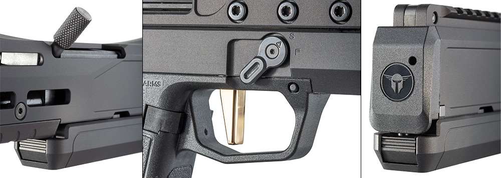 The flat, bottom edge of the receiver, between the release button and the trigger guard, has two more M-Lok slots to accommodate accessories including laser sights, light modules, bipods and vertical grips. The bilateral, short-throw safety selector levers are positioned just above the trigger guard. Fitted closely to the receiver, using the trigger finger, they swing down into the Safe position and up into the Fire position. Although the safety levers are flat and relatively small to complement the rifle’s no-snag configuration, the “S” and “F” markings on the receiver could stand to be larger and easier to see for those of us who use corrective lenses.
