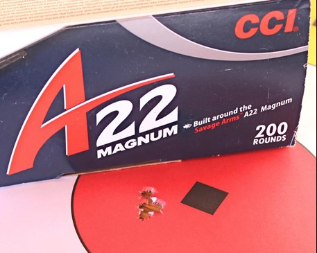 The heaviest bullet of the three test loads, a 40-gr. jacketed hollow point, was launched by Winchester's Super-X round which is intended for varmints and small game. It lost about 67 f.p.s. of muzzle velocity when compared to the manufacturer's listed velocity for 302 ft.-lbs. of energy. Hornady's 25-gr NTX ballistic tip gained 104 f.p.s. of velocity for 295 ft.-lbs. of energy. The hardest hitting load was also the most accurate. CCI Ammunition's A22 35-gr. Game Point soft points were designed to run reliably in the Savage A22 semi-automatic rifle. The cartridge's consistency and potent powder charge only gained 27 f.p.s. in muzzle velocity but the bullets were landing with 352 ft.-lbs. of energy.