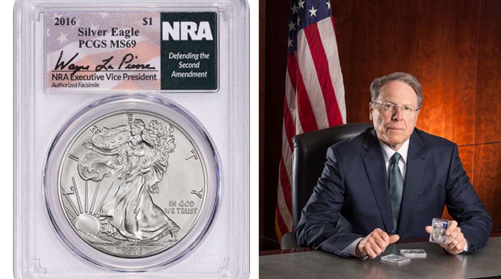 Image: Left, a handsome, one-ounce American Eagle silver bullion coin and the special insert label with facsimile signature of NRA Executive Vice President Wayne LaPierre, shown right holding one of the coins and special insert label.