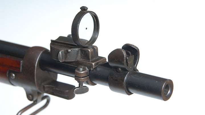 Yet another sight, commonly referred to as the “Lattey,” having been developed by Capt. Lattey of the NRA School of Musketry at Bisley, was rapidly being embraced by the British military for use on the SMLE. Compared with the other Galilean types, it was mounted to the rifle in a slightly different fashion.